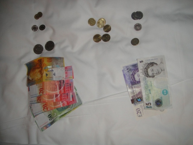 Since Switzerland doesn’t use Euros (they aren’t a part of the EU), we use Swiss Francs day to day. I also keep a small amount of Euro change since we are on a border town of France, and in case I need a bus ticket there, etc. When we arrived in London this weekend, the pounds and pence added a third dimension. I surely have to keep them separate as you can’t tell the coins apart at a glance (or at least I have not become that skilled yet). So, I have my little change purse divided up with all the different currencies.