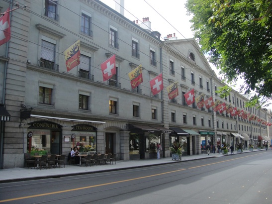 he population of Geneva doubled by 10,000 in one year in the 16th Century as French and Italian Protestant refugees fled from their countries into Switzerland to escape the massacres. Since it was a walled city for its own protection, they ran out of room and had to go upward. See the different stories and window patterns as you go up?